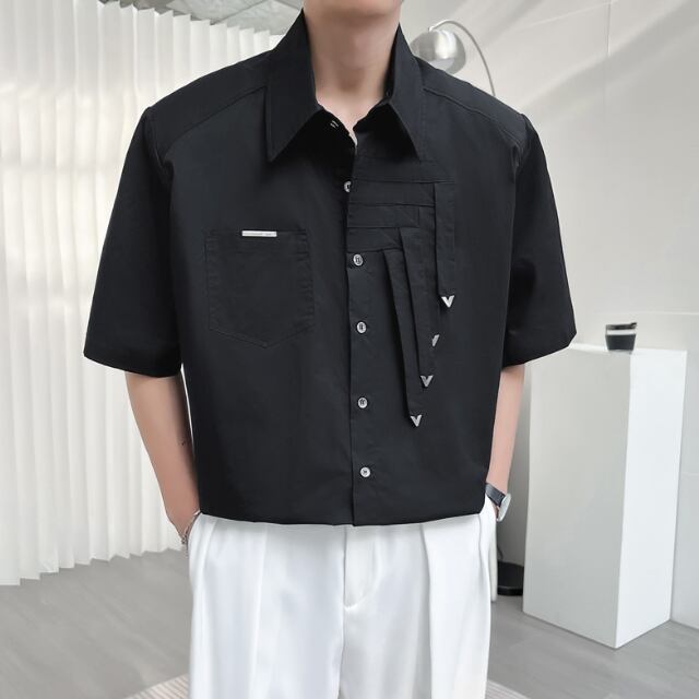 【予約販売】シャツ 半袖 シンプル 無地 個性的 モード デザイン アシンメトリー メンズ ホワイト ブラック カジュアル シック こなれ感 お洒落 韓国 トレンド 春 夏 M/L/XL