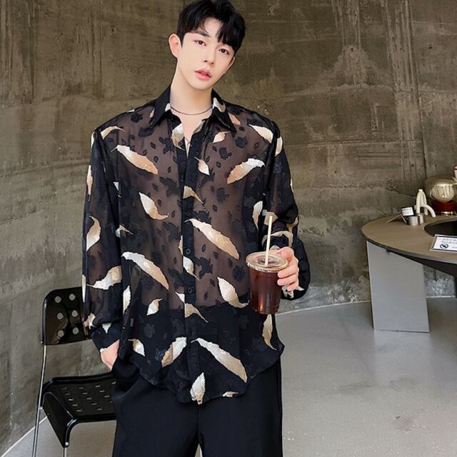 【予約販売】シャツ 長袖 透け感 肌見せ シアー メンズ 模様 フェザー柄 総柄 ブラック カジュアル シック 結婚式 フォーマル こなれ感 お洒落 韓国 トレンド 春 夏 M/L/XL