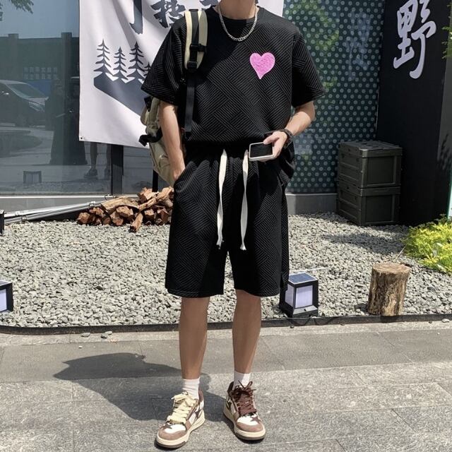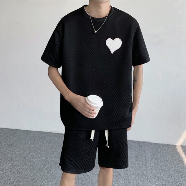 【予約販売】メンズ セットアップ 無地 シンプル 半袖 ハーフパンツ ブラック ホワイト ハート スエット カジュアル 部屋着 カジュアル パンツ セット ジャージ ジム スポーティー ダンス ジム 韓国 トレンド 大きいサイズ M/L/XL/2XL/3XL