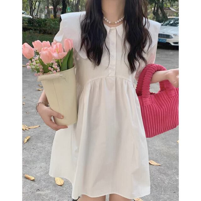 ワンピース レディース ミニワンピ 膝上丈 ショート丈 ビッグカラー ガーリー ハイウエスト パフスリーブ スクエアネック 旅行 デート お出かけ ショッピング おしゃれ 可愛い 無地 ピンク/ホワイト S/M/L/XL