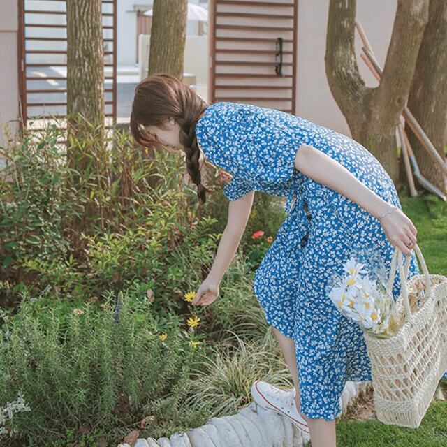 ワンピース レディース ミディワンピ 膝下丈 カシュクール 花柄 小花柄 フラワープリント シフォン 半袖 ボリュームスリーブ 可愛い おしゃれ 旅行 デート リゾート 華奢見せ ブルー XS/S/M/L/XL/2XL