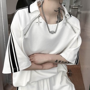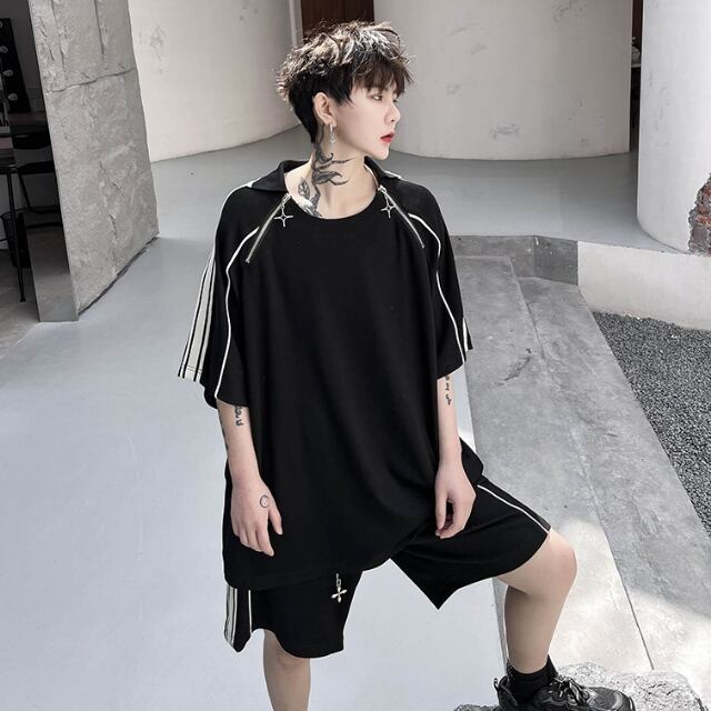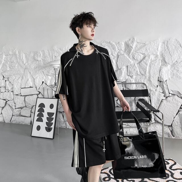 【予約販売】メンズ セットアップ 上下 バイカラー ライン 半袖 ハーフパンツ ストリート ブラック ホワイト 韓国 ジム スポーツウエア カジュアル 春 夏 大きいサイズ M/L/XL