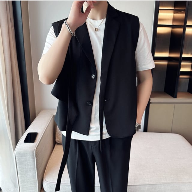 【予約販売】3点セット メンズ セットアップ ベスト パンツ Tシャツ 変形デザイン 無地 男前 ブラック ホワイト 上下 パーティ お出かけ パーティー 二次会 結婚式 M/L/XL/2XL