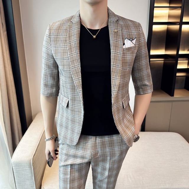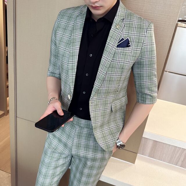 【予約販売】2点セット スーツ メンズ セットアップ 五分袖 ジャケット パンツ グレンチェック柄 男前 グリーン ベージュ 上下 パーティ お出かけ パーティー 二次会 結婚式 夏 S/M/L/XL/2XL/3XL