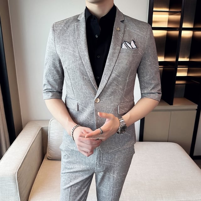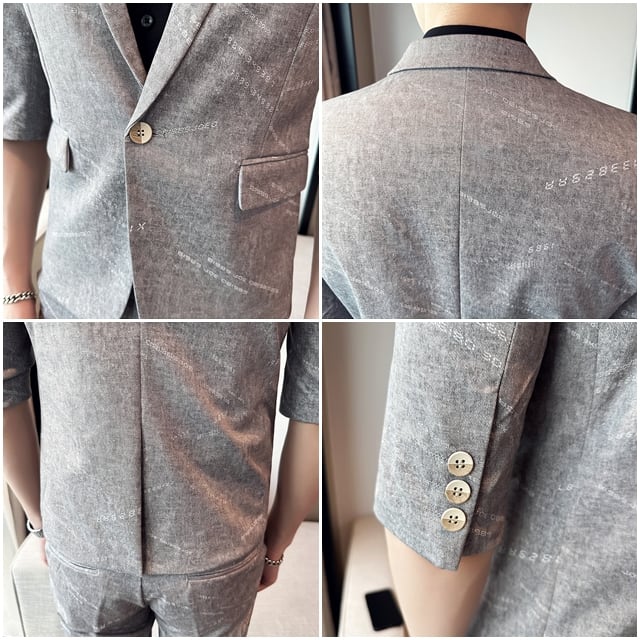 【予約販売】3点セット スーツ メンズ セットアップ 五分袖 ジャケット パンツ Tシャツ 総柄 男前 ブルー グレー コーヒー 上下 パーティ お出かけ パーティー 二次会 結婚式 夏 S/M/L/XL/2XL/3XL