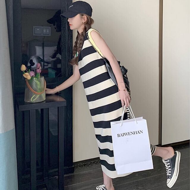 ワンピース ロング丈 ロングワンピ ノースリーブ ラウンドネック ストレート ボーダー カジュアル 楽チン おしゃれ サイズ展開豊富 XS/S/M/L/XL/2XL