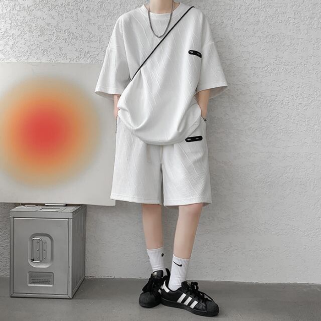 【予約販売】メンズ セットアップ 上下 半袖 ハーフパンツ ホワイト/ベージュ/ブラック シンプル ストリート 部屋着 韓国 ジム スポーツウエア カジュアル 春 夏 大きいサイズ M/L/XL/2XL/3XL/4XL/5XL