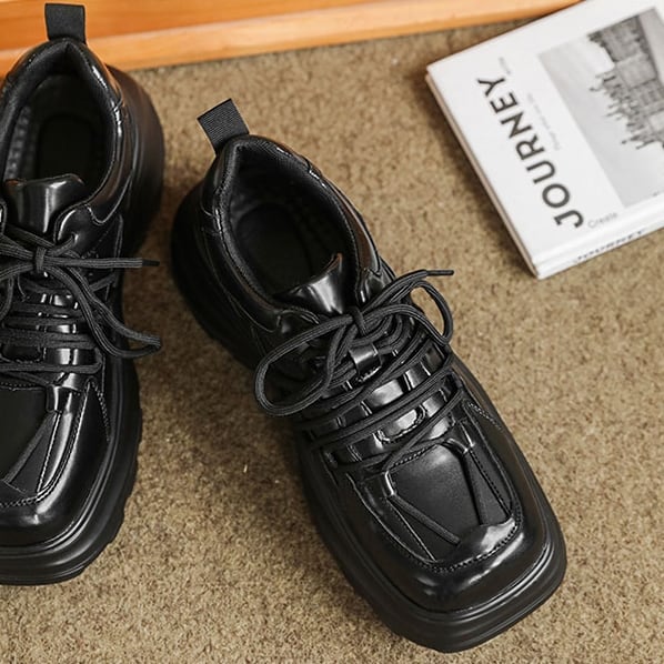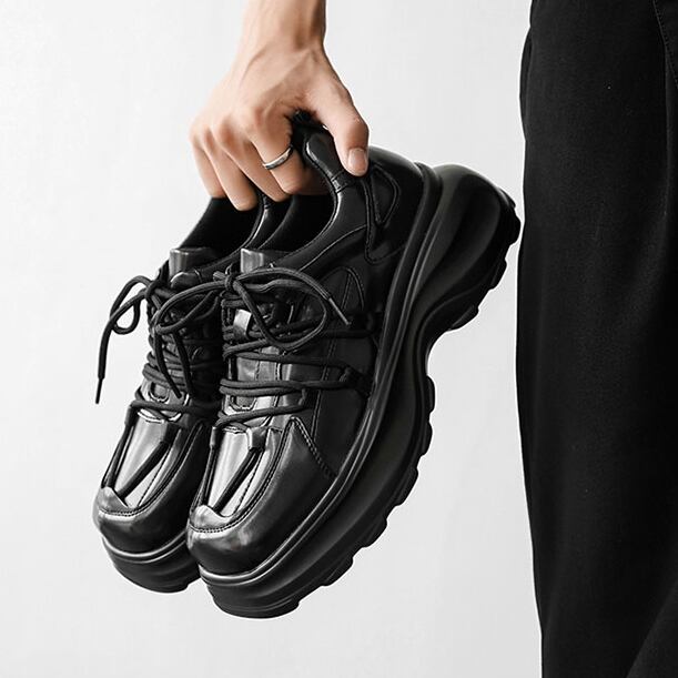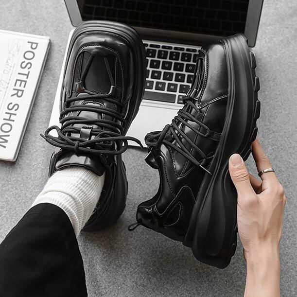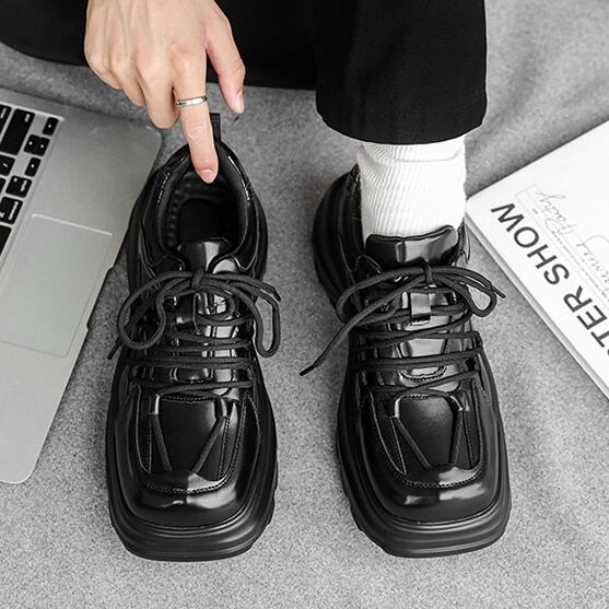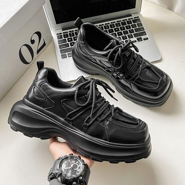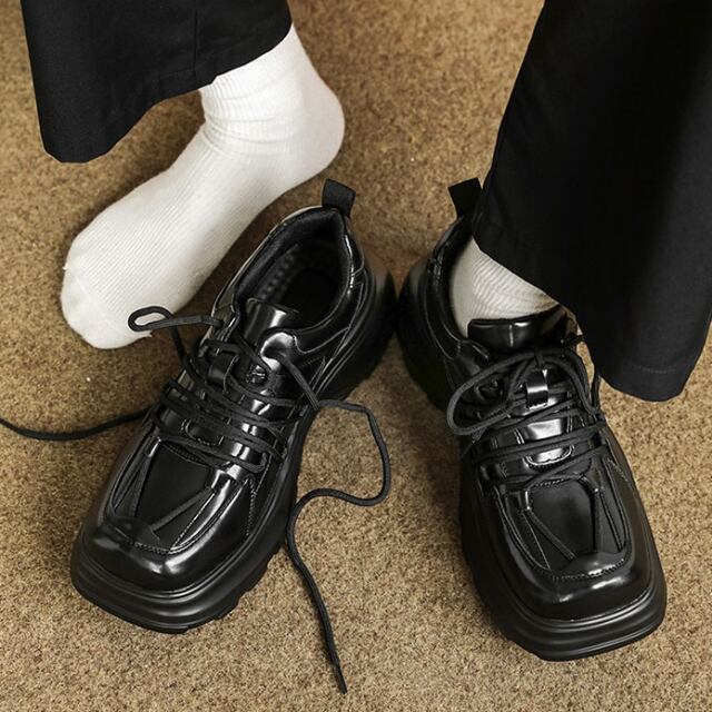 【予約販売】スニーカー 韓国 メンズ ダッドスニーカー 革靴風 厚底 靴 ブラック 黒 デザイン スポーティ お洒落 カジュアル ストリート 24cm/24.5cm/25cm/25.5cm/26cm/26.5cm
