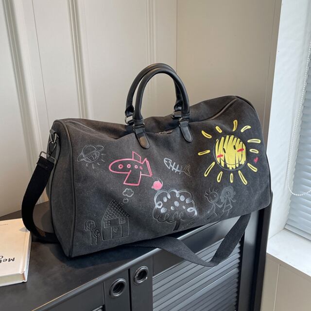 【予約販売】ボストンバッグ ショルダーバッグ 2Way メンズ 落書き ペイント 大容量 レディース ブラック カーキ 黒 トラベル 大型 旅行 出張 ジム スポーツ ヨガ フィットネス 旅行かばん こなれ感 お洒落 韓国 トレンド