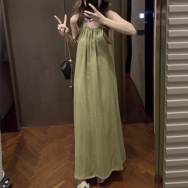 ワンピース レディース ロングワンピ ロング丈 キャミワンピ 夏 フレア リゾート 旅行 デート お出かけ グリーン/アプリコット
