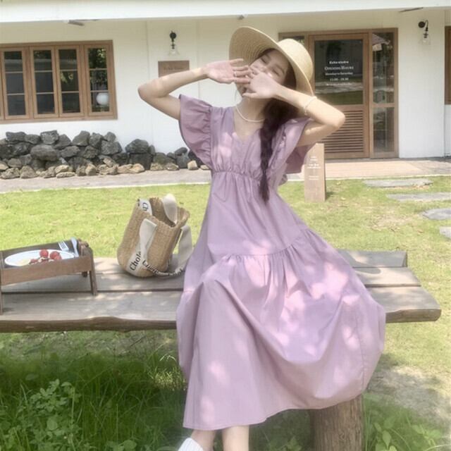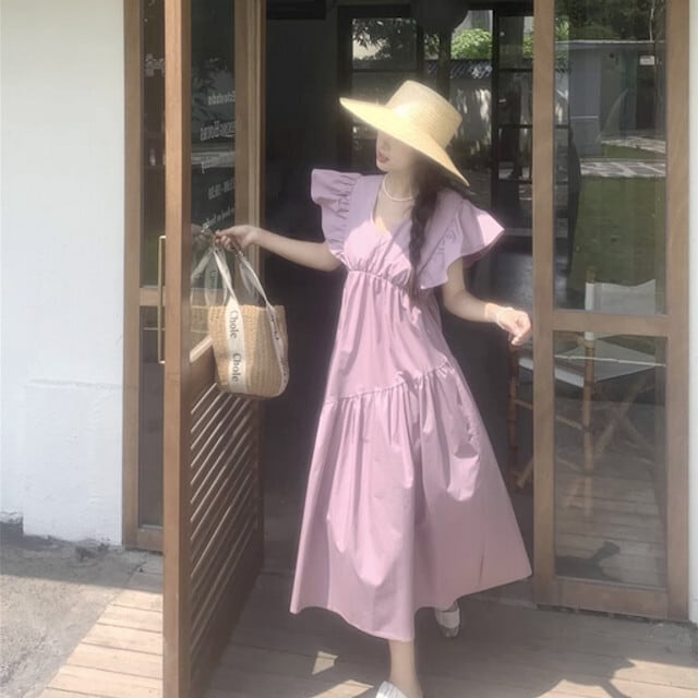 ワンピース レディース ロングワンピ ロング丈 フライングスリーブ かわいい フリル 袖あり 春夏 旅行 リゾート お出かけ デート パープル