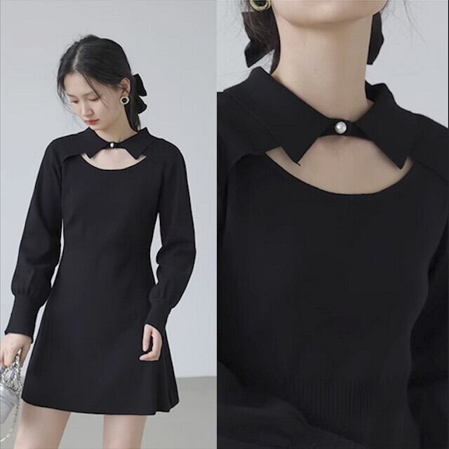 ワンピース レディース ひざ上丈 ミニワンピ ミニ丈 長袖 肌見せ ニット フレア 上品 かわいい おしゃれ お出かけ おめかし デート 秋冬 ブラック/レッド