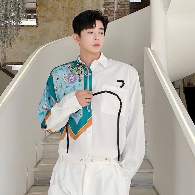 【予約販売】シャツ 長袖 シンプル 無地 スカーフ風 アシンメトリー メンズ ホワイト レトロ カジュアル シック こなれ感 お洒落 韓国 トレンド 春 秋 M/L/XL