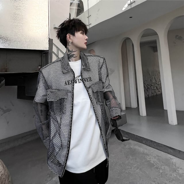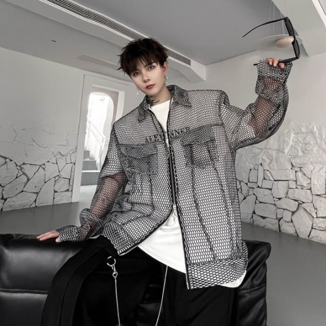【予約販売】ブルゾン ダブルジップアップ 長袖 透け感 肌見せ メッシュ シアー メンズ 無地 黒 ブラック カジュアル シック こなれ感 お洒落 韓国 トレンド 春 秋 夏 M/L/XL