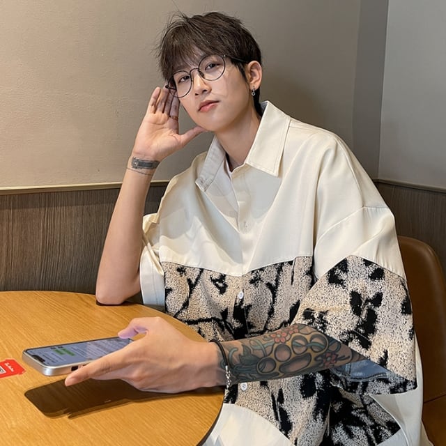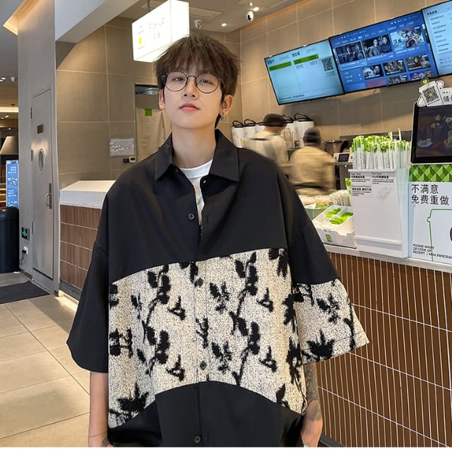 【予約販売】シャツ 半袖 シンプル 切り替え 花柄 ベーシック モノトーン メンズ ボタン オフホワイト ブラック カジュアル シック こなれ感 お洒落 結婚式 パーティー 韓国 トレンド 春 秋 M/L/XL/2XL