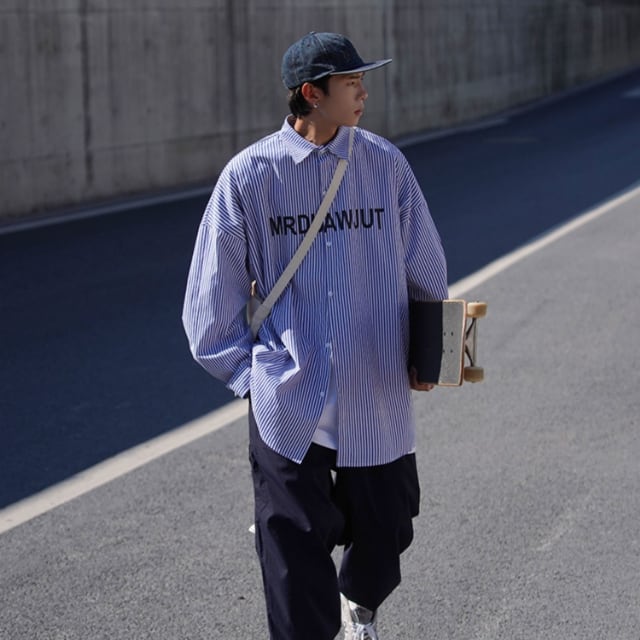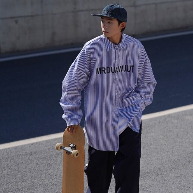 【予約販売】シャツ 長袖 トップス ストライプ柄 メンズ グレー ブルー グリーン こなれ感 カジュアル シンプル モード お洒落 こなれ感 韓国 トレンド 春 夏 秋 M/L/XL/2XL