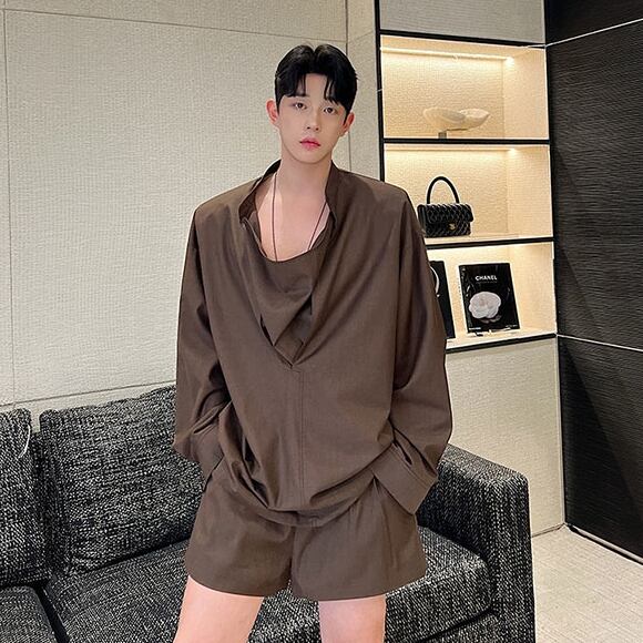 【予約販売】メンズ セットアップ 上下 ハーフパンツ 長袖シャツ 無地 ブラウン ノーカラー カジュアル 春夏 韓国 トレンド こなれ感 M/L/XL