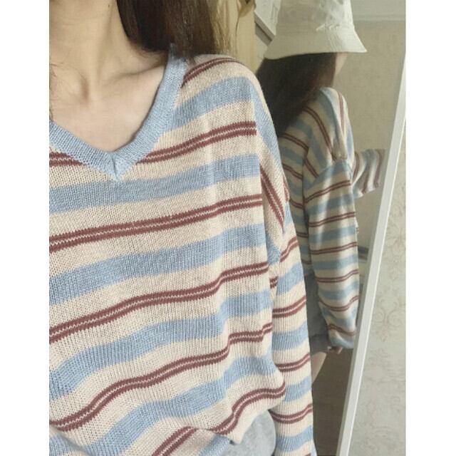ニット セーター レディース トップス 長袖 Vネック マルチボーダー ルーズフィット オーバーシルエット カジュアル メンズライク おしゃれ かわいい ブルー レッド 秋冬 S/M/L