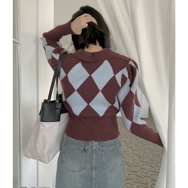 ニット カーディガン レディース トップス 襟付き 長袖 ショート丈 脚長効果 デート お出かけ レトロ 市松模様 秋冬 かわいい おしゃれ ブラック/レッド S/M/L