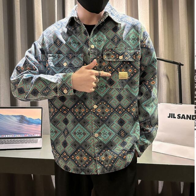 【予約販売】ブルゾン アウター デニム Gジャン ネイティブ柄 グリーン メンズ お洒落 こなれ感 カジュアル ベーシック 秋 春 大きいサイズ M/L/XL/2XL/3XL