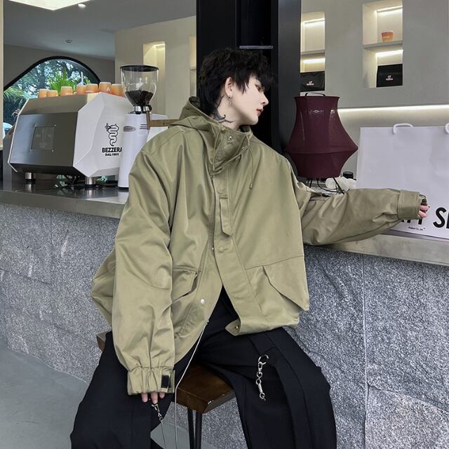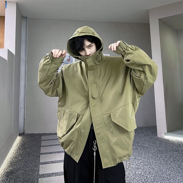 【予約販売】ブルゾン ステンカラー フード付き 無地 オーバーサイズ カーキ ブラック ショート丈 ジャケット 防寒 お洒落 こなれ感 ベーシック 秋冬 大きいサイズ M/L/XL
