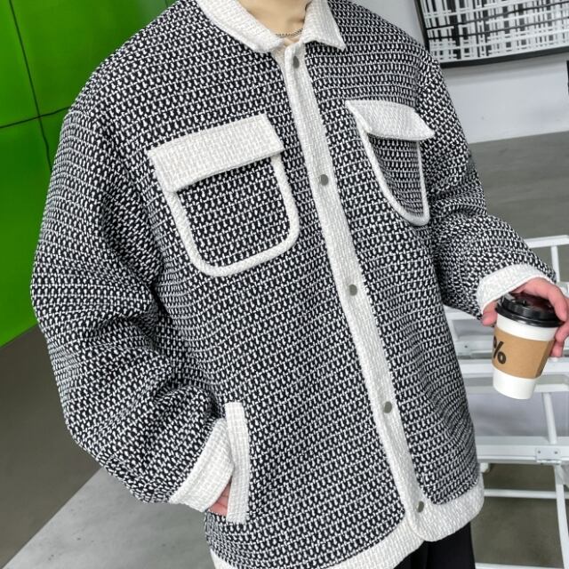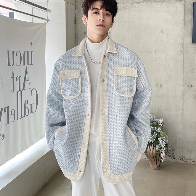 【予約販売】ジャケット アウター ホワイト/ブルー/ブラック バイカラー ショート丈 メンズ レトロ クラシカル お洒落 こなれ感 シック トレンド 秋 春 S/M/L/XL/2XL