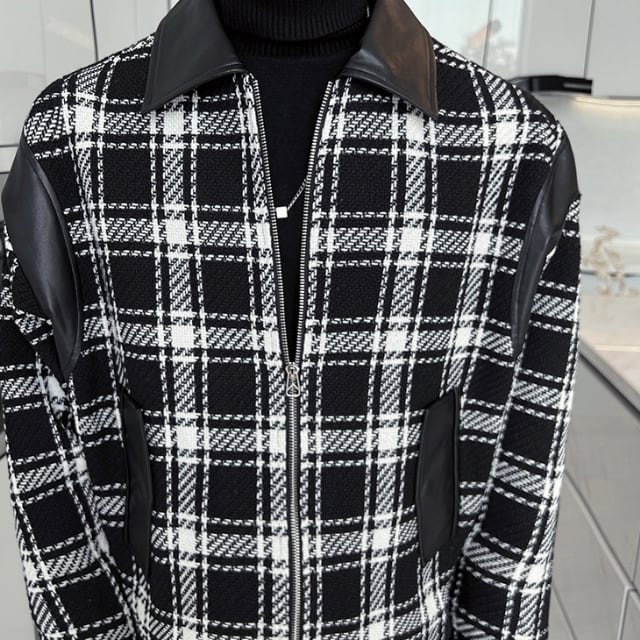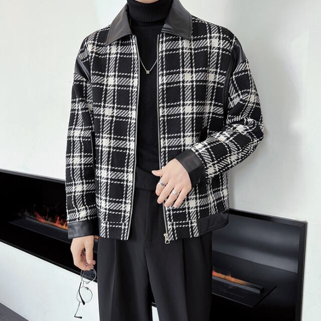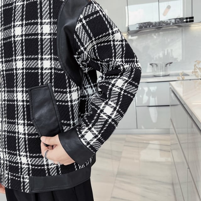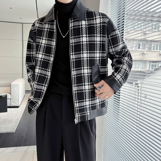 【予約販売】ジャケット アウター ツイード ブラック チェック柄 レザー 異素材 ショート丈 メンズ レトロ クラシカル お洒落 こなれ感 シック トレンド 秋 春 M/L/XL/2XL