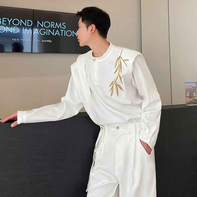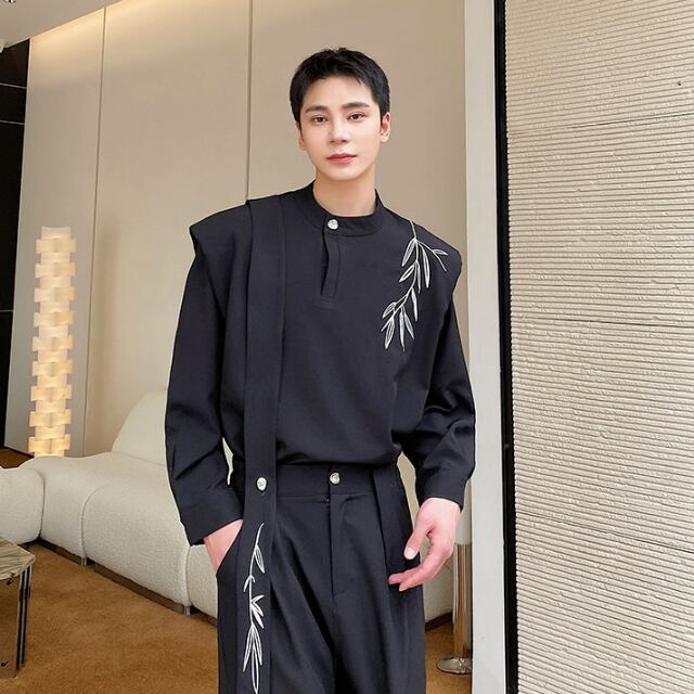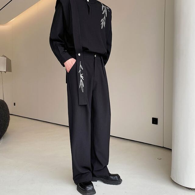 【予約販売】メンズ セットアップ 上下 長袖シャツ 刺繍 ブラック ホワイト モード 男前 韓国 パンツ セット カジュアル お洒落 韓国 トレンド 大きいサイズ M/L/XL