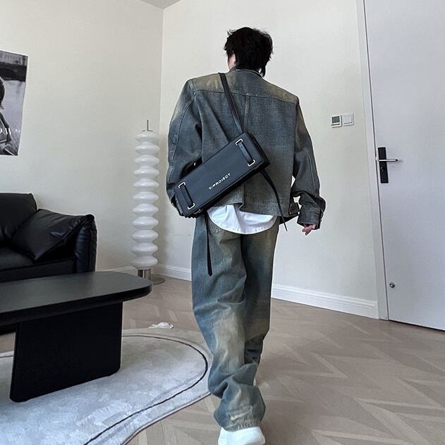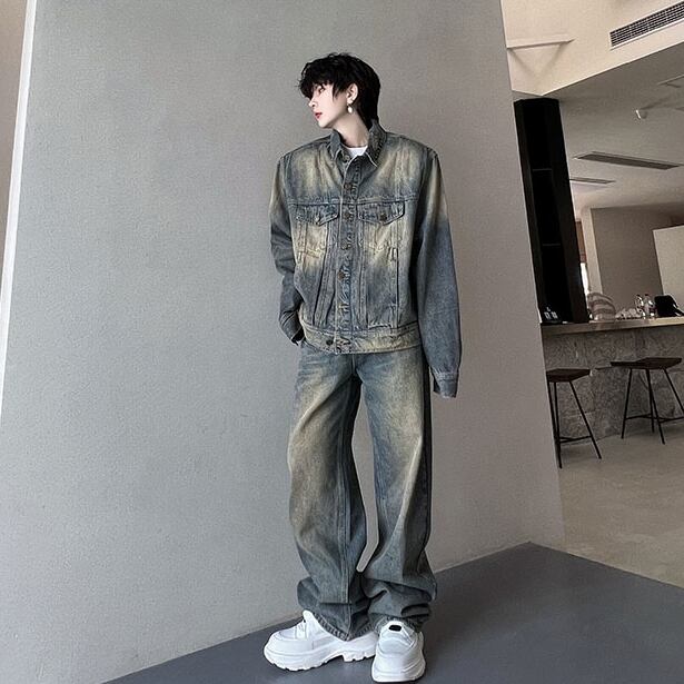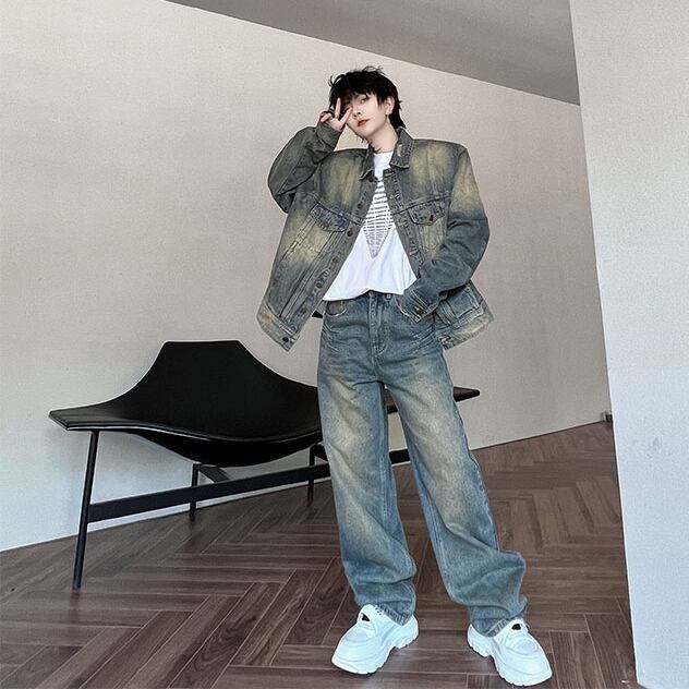 【予約販売】メンズ セットアップ メンズ デニム カジュアル ブルー Gジャン ウォッシュ加工 なれ感 韓国 ベーシック シンプル パンツ セット セットアップ ワイド トレンド M/L/XL