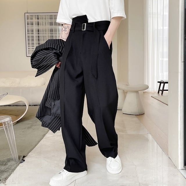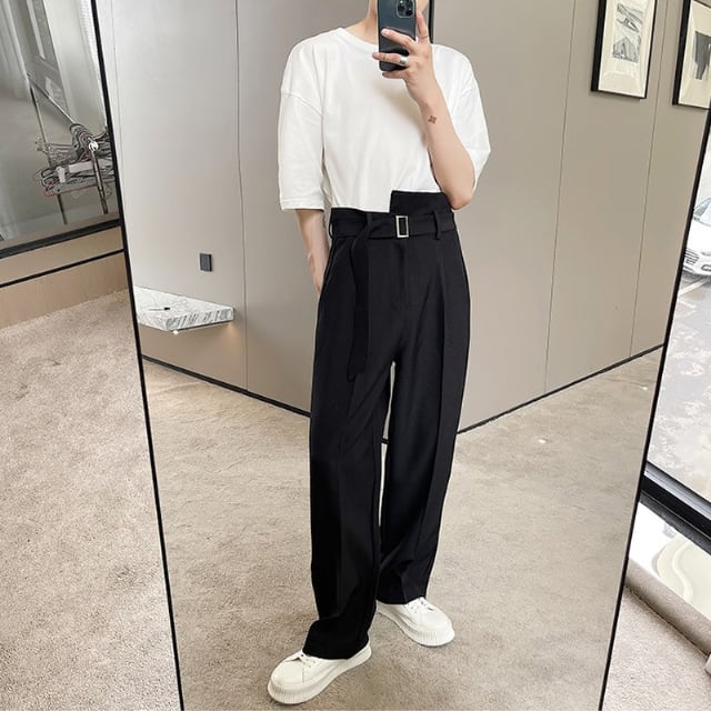 【予約販売】パンツ ボトムス メンズ タッグ ハイウエスト 黒 ブラック アシンメトリー カジュアル こなれ感 お洒落 韓国 トレンド 秋 冬 M/L/XL