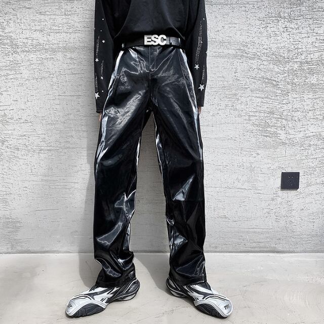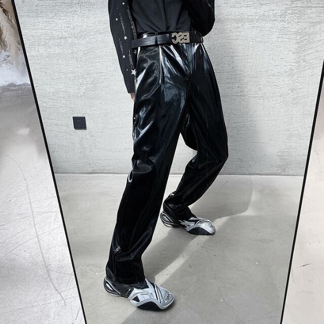 【予約販売】パンツ ボトムス メンズ 光沢 黒 ブラック 無地 ルーズ カジュアル シンプル こなれ感 お洒落 韓国 トレンド 秋 冬 M/L/XL/2XL