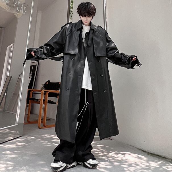 【予約販売】コート ロングコート アウター ロング丈 黒 レザー シンプル 通学 ビジネス 防寒 メンズ ブラック シック 防寒 お洒落 こなれ感 ベーシック 秋冬 M/L/XL