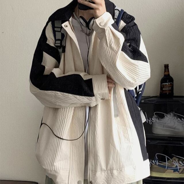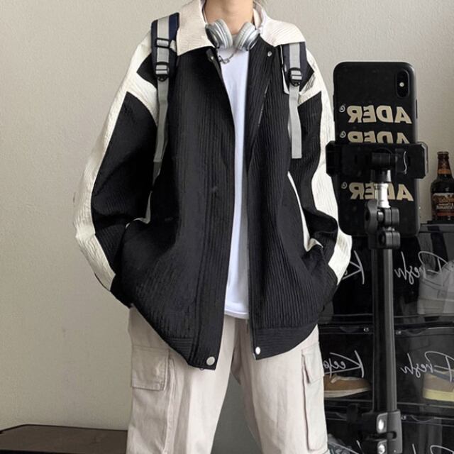 【予約販売】ブルゾン ジャンバー 長袖 コーチジャケット アウター メンズ バイカラー アイボリー/ブラック/カーキ 無地 お洒落 こなれ感 韓国 ベーシック 秋 冬 大きいサイズ M/L/XL/2XL