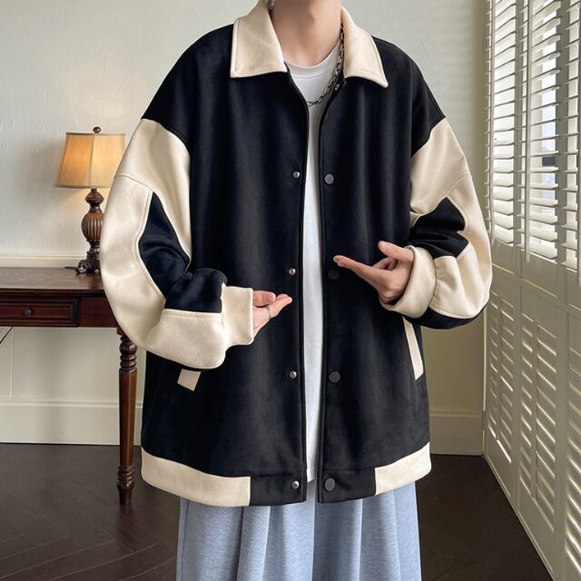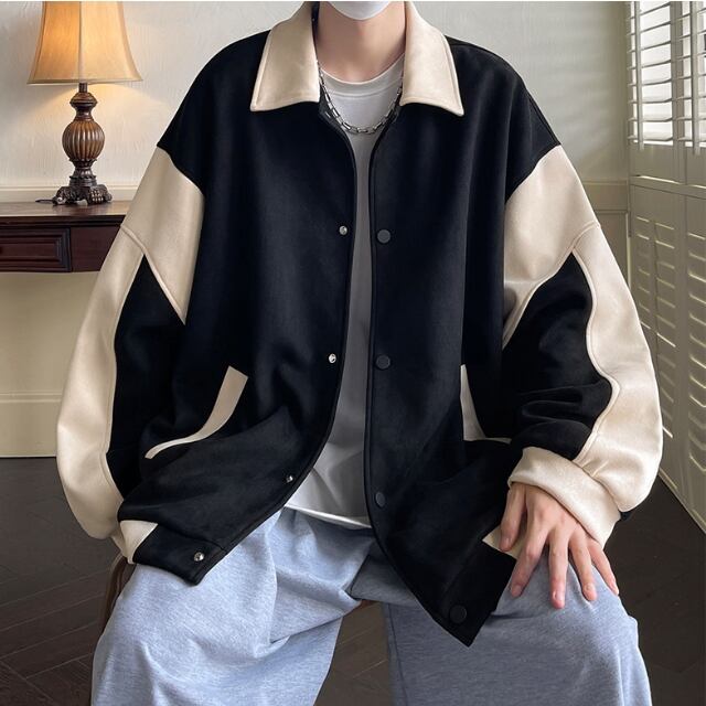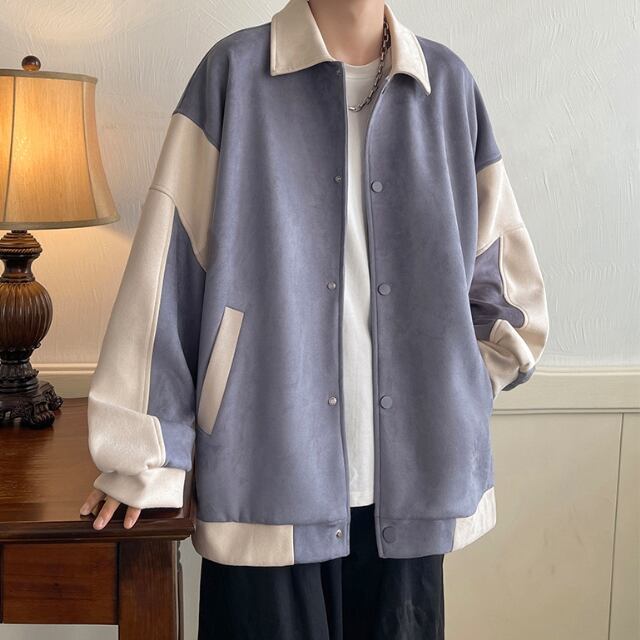 【予約販売】ブルゾン アウター スエード ジップアップ 無地 ツートン バイカラー ブラック グレー 防寒 ジャケット ベーシック メンズ カジュアル 男前 こなれ感 お洒落 韓国 トレンド 秋 冬 M/L/XL/2XL