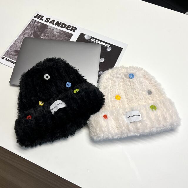 もこもこなニットとカラフルなボタンが