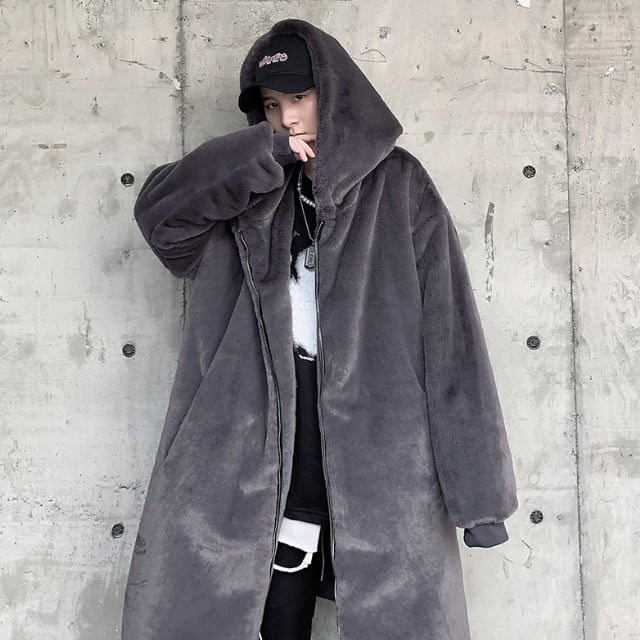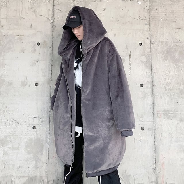 【予約販売】ファーコート フード メンズ フーディ ミドル丈 ビッグシルエット グレー ブラック コート 韓国 防寒 お洒落 こなれ感 ベーシック 秋冬 大きいサイズ S/M/L/XL/2XL