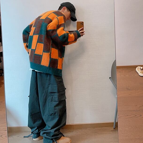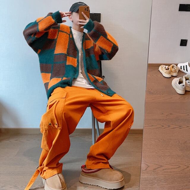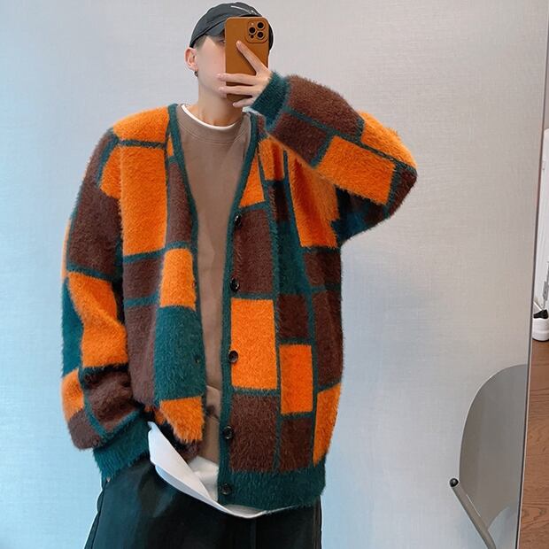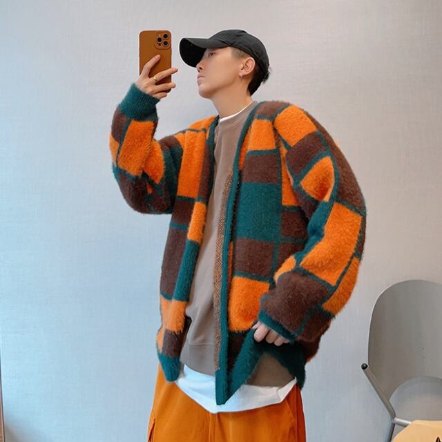 【予約販売】カーディガン ニット セーター ブロック柄 総柄 メンズ オレンジ グリーン オーバーサイズ こなれ感 ストリート お洒落 韓国 トレンド 秋冬 M/L/XL/2XL