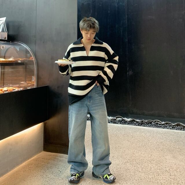 【予約販売】ニット セーター ボーダー柄 メンズ 黒白 襟付き オーバーサイズ こなれ感 ストリート お洒落 韓国 トレンド 秋冬 S/M/L