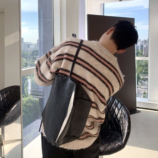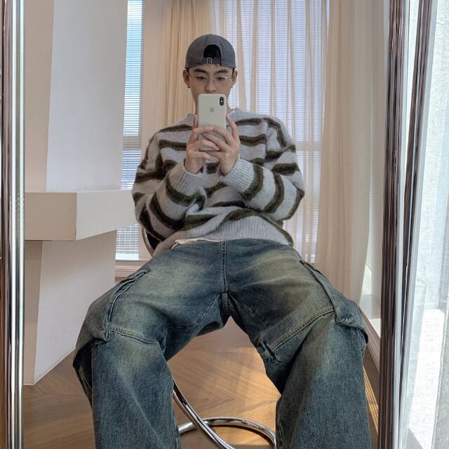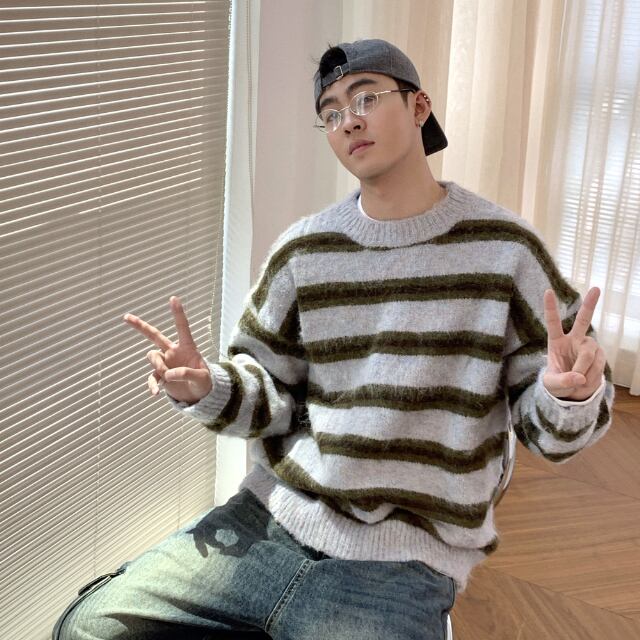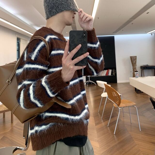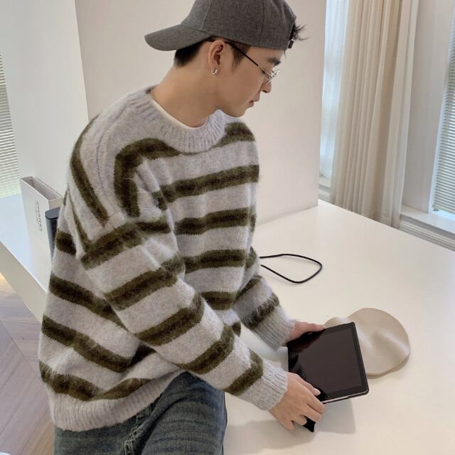 【予約販売】ニット セーター ボーダー柄 起毛 メンズ ピンク/グレー/ブラウン オーバーサイズ こなれ感 ストリート お洒落 韓国 トレンド 秋冬 S/M/L/XL