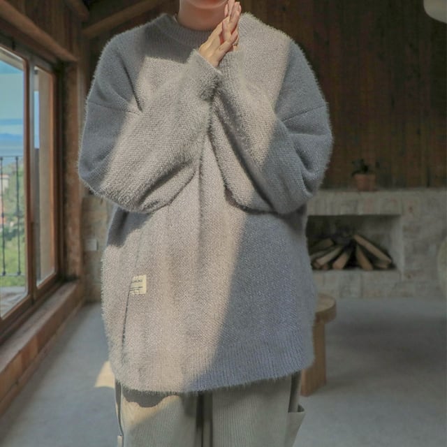 【予約販売】ニット セーター オーバーサイズ モヘア タグ ルーズ 無地 ラウンドネック メンズ ブラック/ベージュ/グレー こなれ感 ストリート お洒落 韓国 トレンド 秋冬 M/L/XL/2XL