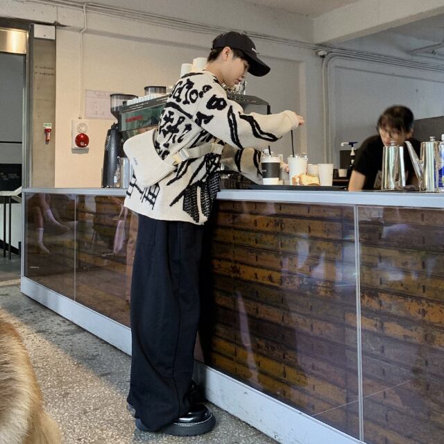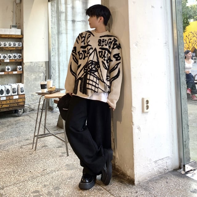 【予約販売】ニット セーター 落書き風 メンズ ベージュ ラウンドネック オーバーサイズ こなれ感 ストリート お洒落 韓国 トレンド 秋冬 S/M/L/XL