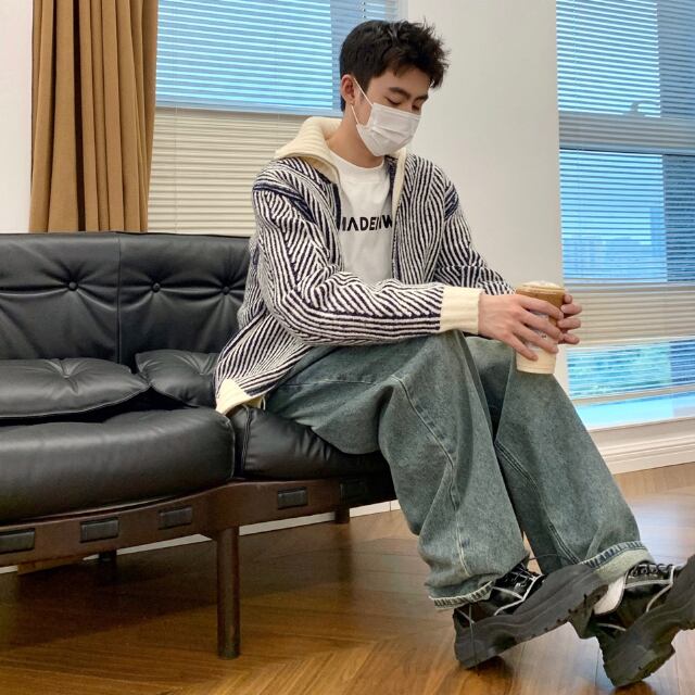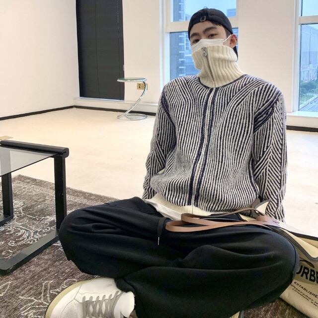 【予約販売】ニット セーター ジップアップ ハイネック ストライプ柄 メンズ オーバーサイズ こなれ感 ストリート お洒落 韓国 トレンド 秋冬 S/M/L/XL