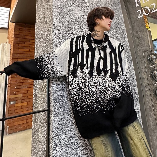 【予約販売】ニット セーター オーバーサイズ ダメージ加工 ラウンドネック グラデーション メンズ ブラック ホワイト こなれ感 ストリート お洒落 韓国 トレンド 秋冬 M/L/XL/2XL