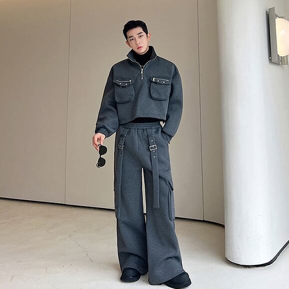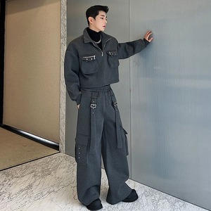 【予約販売】メンズ セットアップ 上下 長袖 ポケット ベルト ダークグレー ライトグレー スエット 男前 スエット 韓国 パンツ セット ジム カジュアル 部屋着 リラックス ルームウエア 韓国 トレンド 大きいサイズ M/L/XL