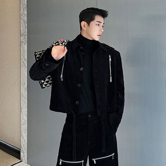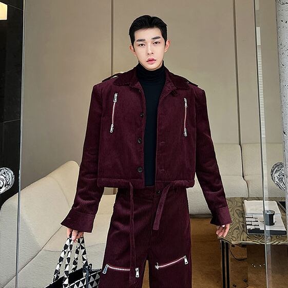 【予約販売】メンズ セットアップ 上下 長袖 コーデュロイ ブラック ワイン ショート丈 ジッパーデザイン 男前 韓国 パンツ セット カジュアル 韓国 トレンド M/L/XL