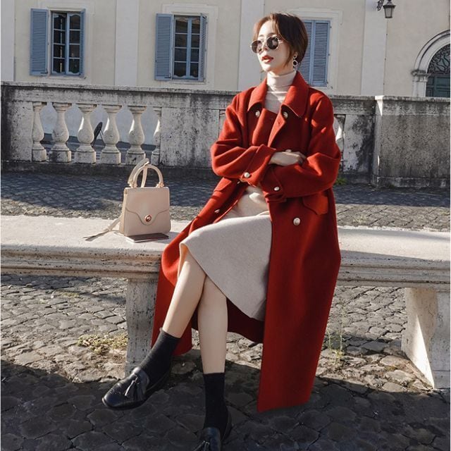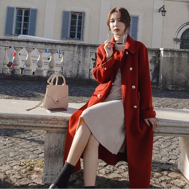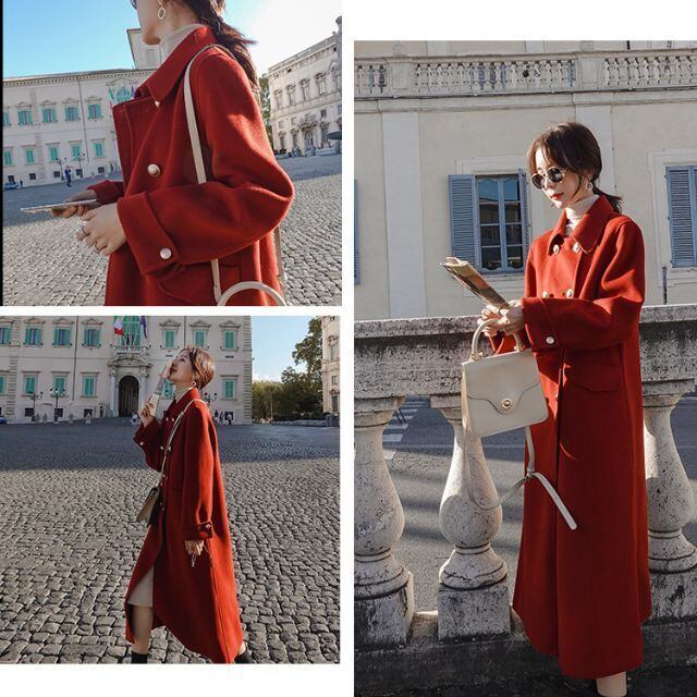 【予約販売】コート レディース ロングコート ダブルボタン ゆったり ルーズ シンプル 無地S,M レッド/ブラック