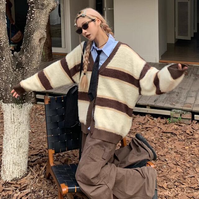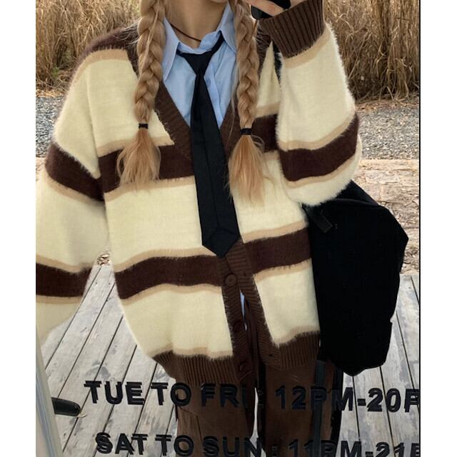 カーディガン レディース オーバーシルエット Vネック 長袖 こなれ感 レトロ ボーダー おしゃれ かわいい かっこいい カジュアル お出かけ 秋冬 アプリコット S/M/L