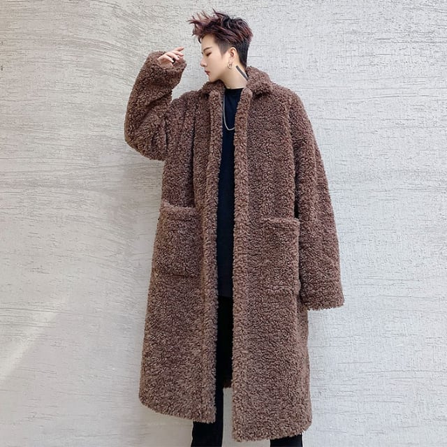 【予約販売】ファーコート フード メンズ ボア ロング丈 もこもこ ビッグシルエット ブラウン コート 韓国 防寒 お洒落 こなれ感 ベーシック 秋冬 M/L/XL