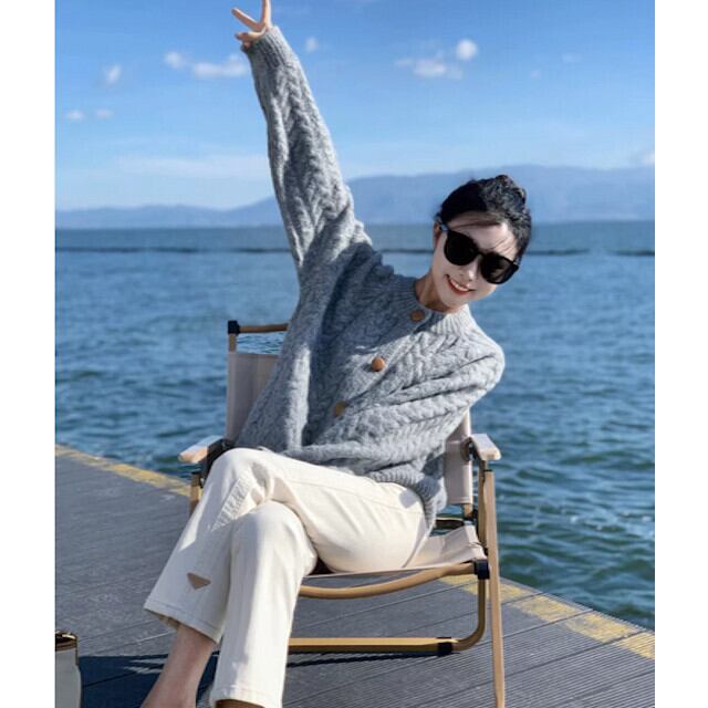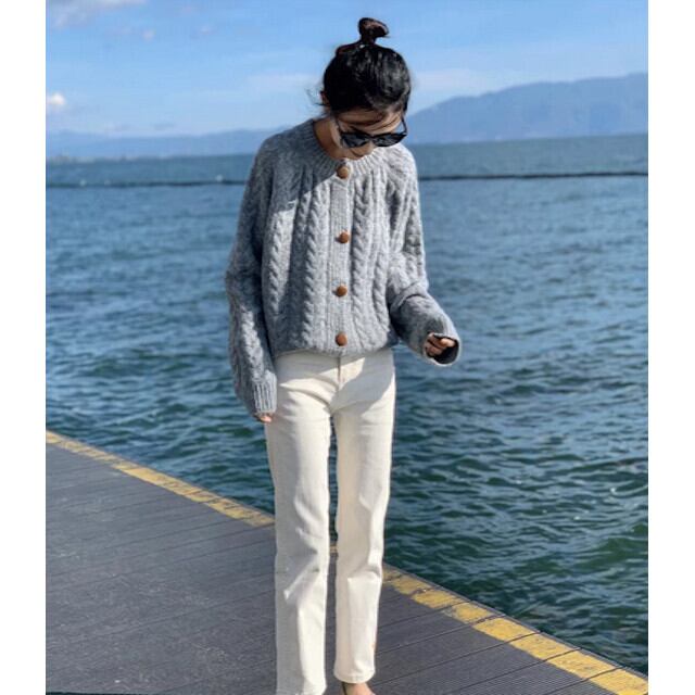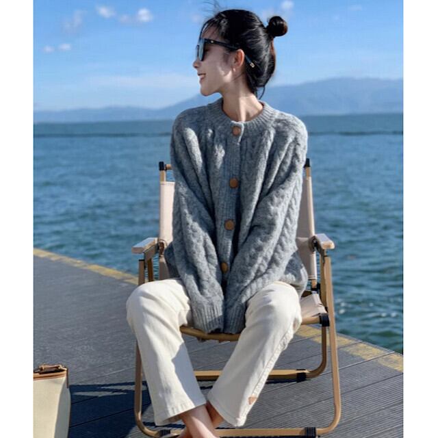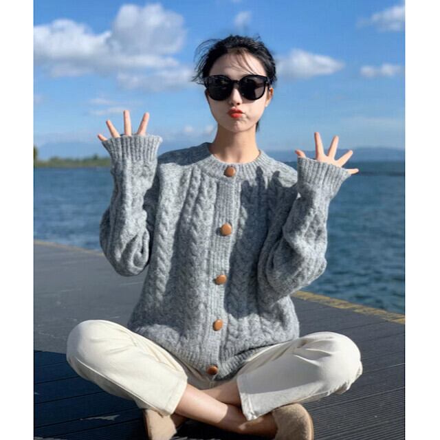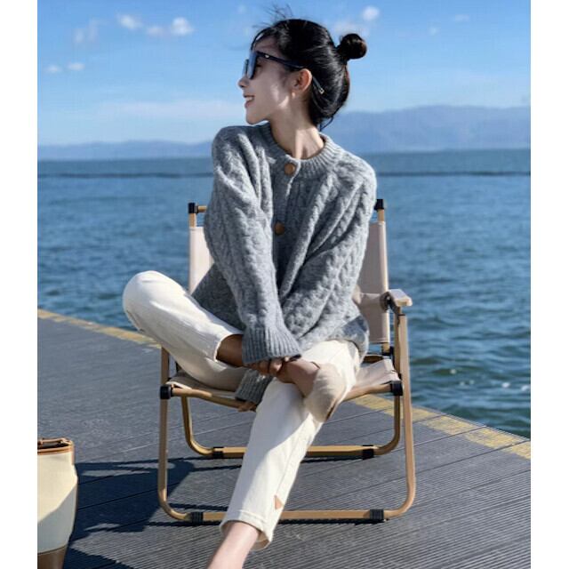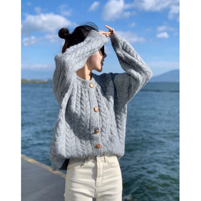 カーディガン レディース トップス ニット 長袖 ラウンドネック あったかい 秋冬 かわいい シンプル おしゃれ 大人可愛い グレー S/M/L/XL