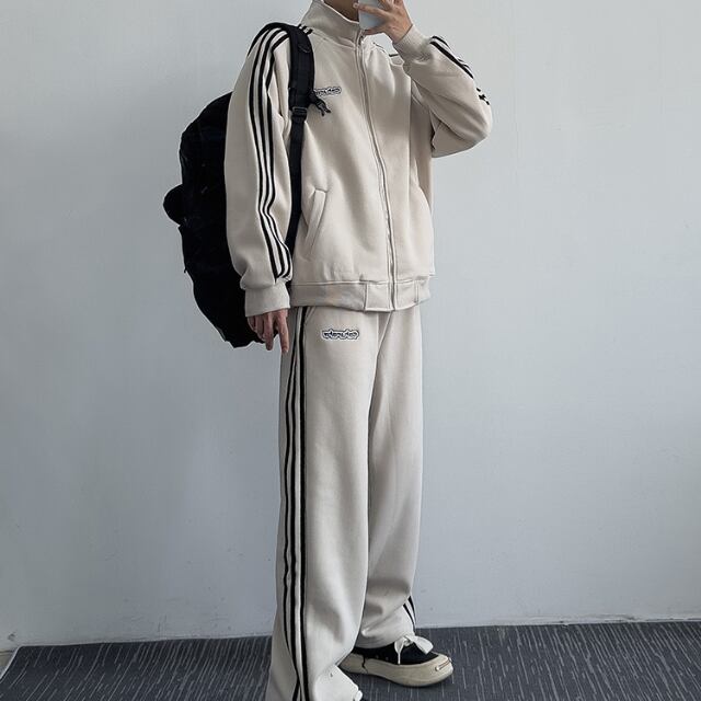 【予約販売】メンズ セットアップ 裏起毛 ジャージ ライン 上下 長袖 無地 ブラック ホワイト ルーズ 男前 スエット 韓国 パンツ セット ジム カジュアル 部屋着 リラックス ルームウエア 韓国 トレンド 大きいサイズ M/L/XL/2XL